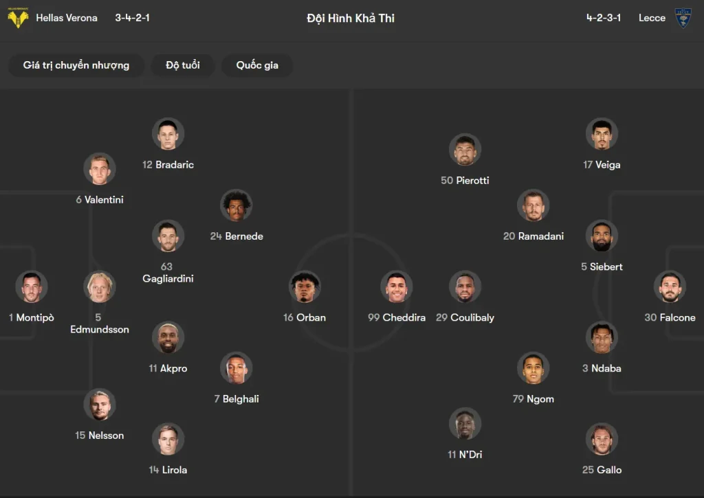 Về mặt chiến thuật, Lecce nhiều khả năng sẽ tập trung khai thác biên, đặc biệt là các pha lên bóng từ cánh trái với khả năng leo biên của Antonino Gallo. Khi đối đầu một đội có xu hướng phòng ngự giãn cự ly như Verona, việc tạt sớm hoặc kéo bóng vào nách trung lộ có thể tạo ra sự khác biệt. Lecce không cần cầm bóng quá nhiều; điều họ cần là những đợt lên bóng đủ rõ ý đồ và tránh phung phí cơ hội ở một phần ba cuối sân.