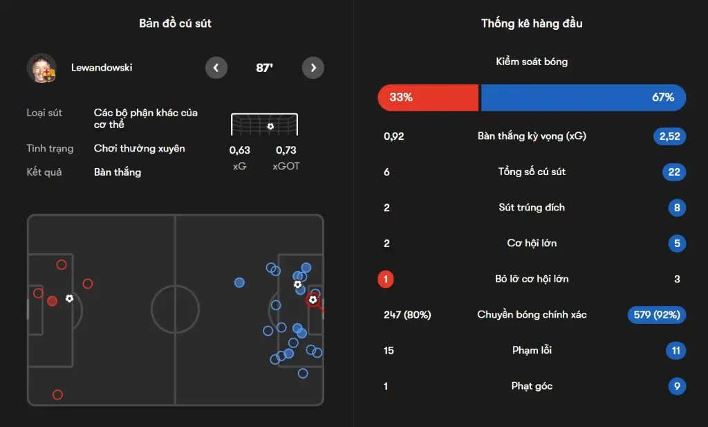 Bàn thắng của Lewandowski có thể mang màu sắc may mắn, nhưng nếu nhìn rộng hơn, nó là kết quả của việc đội khách liên tục duy trì áp lực ở khu vực nguy hiểm. Một tiền đạo đẳng cấp không chỉ ghi bàn bằng những cú dứt điểm hoàn hảo, mà còn biết tạo hiện diện trong vòng cấm để tận dụng bóng bật ra, bóng đổi hướng hoặc khoảnh khắc hàng thủ đối phương mất tập trung. Trong khía cạnh này, Lewandowski vẫn là một trong những trung phong giàu kinh nghiệm nhất châu Âu.